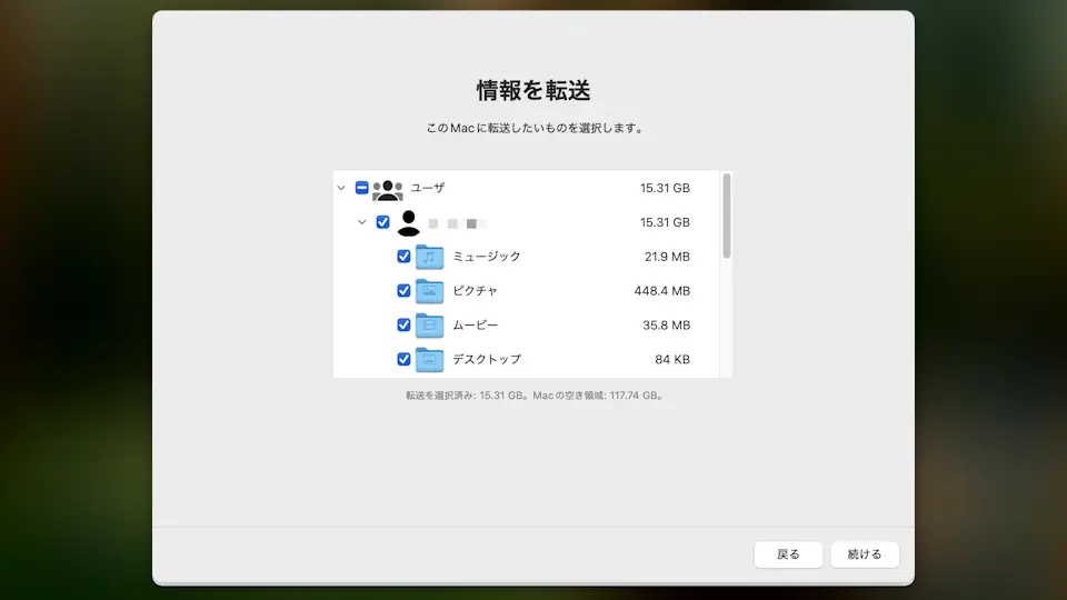 1. 情報を転送より[(必要な項目)]をチェックし【続ける】をクリックします。