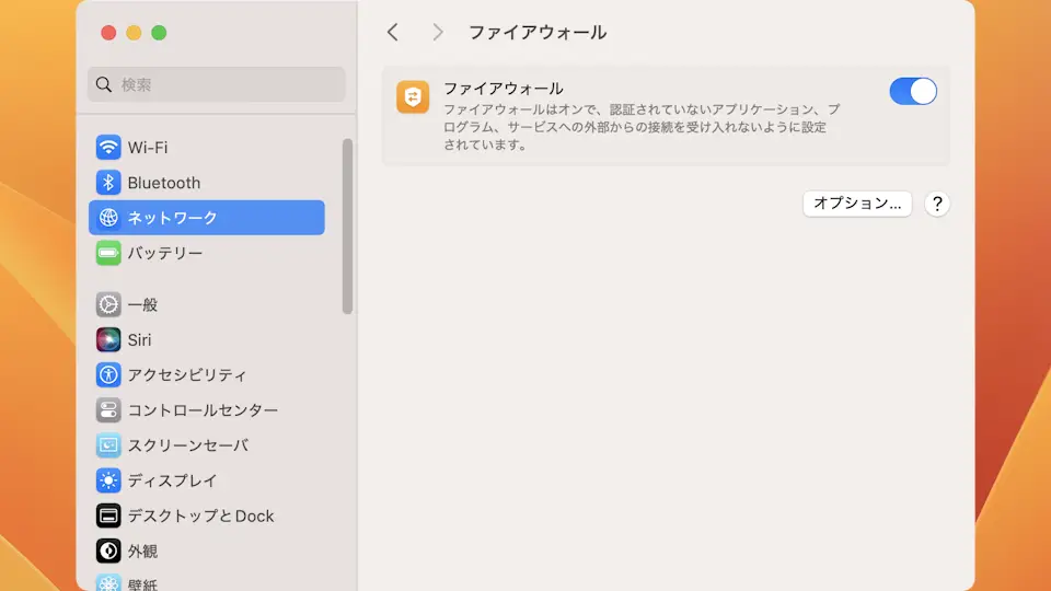 - ファイアウォールより【オプション】をクリックします。