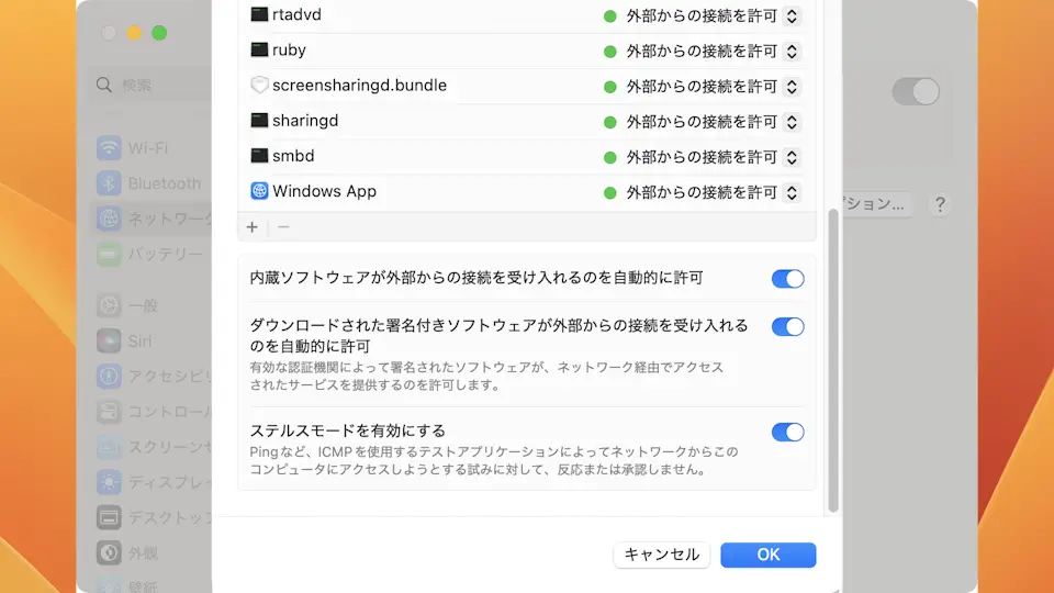 Macには「ネットワーク上から存在を隠す」機能として【ステルスモード】が搭載されています。オンにすればリスクは減りますが、反対にネットワーク上でのトラブルになる場合もあるため、必要に応じてオン/オフを切り替えると良いでしょう。