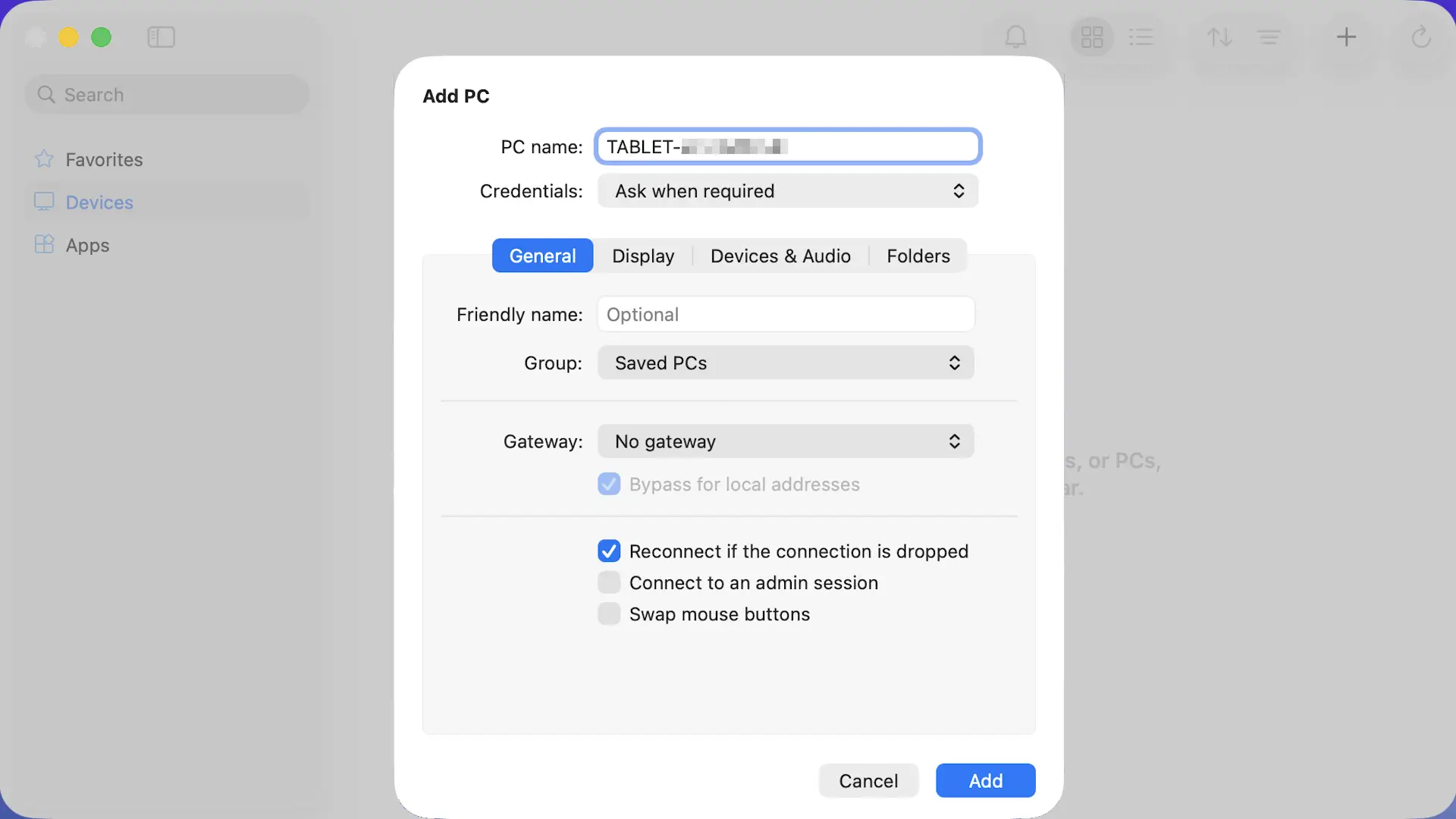 Add PCよりPC nameにホスト名またはIPアドレスを入力し、その他の項目を任意に変更したらAddをクリックします。