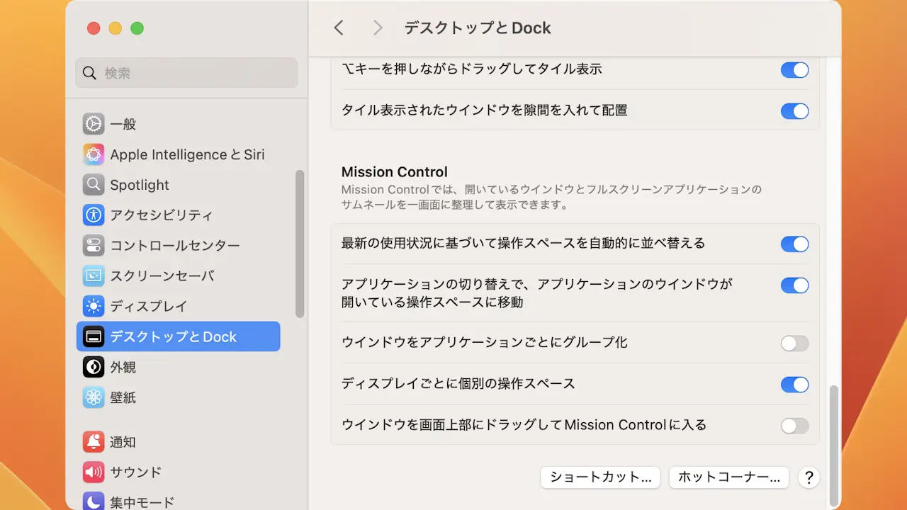 この操作は設定によってオン/オフが可能であるほか、Mission Controlの機能と重複する部分があるため、設定を見直しておくと使いやすくなるかもしれません。