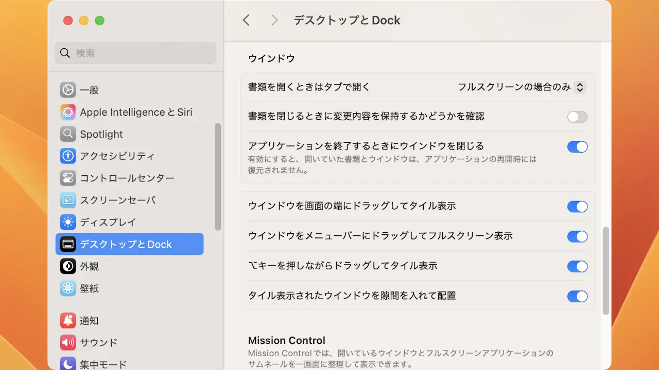 - システム設定のデスクトップとDockよりウィンドウを画面上部にドラッグしてMission Controlに入るをオフに切り替えます。